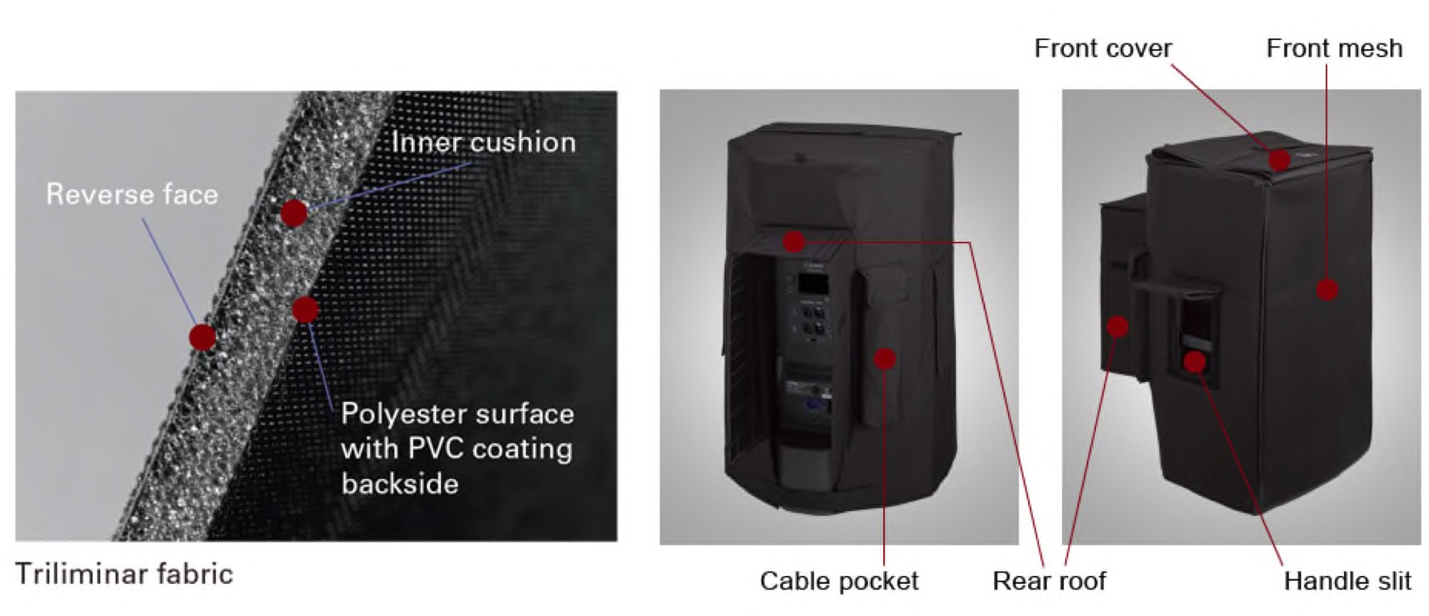 - Trilaminar fabric of durable polyester, with inner PVC coat and cushion inside for impact suppression