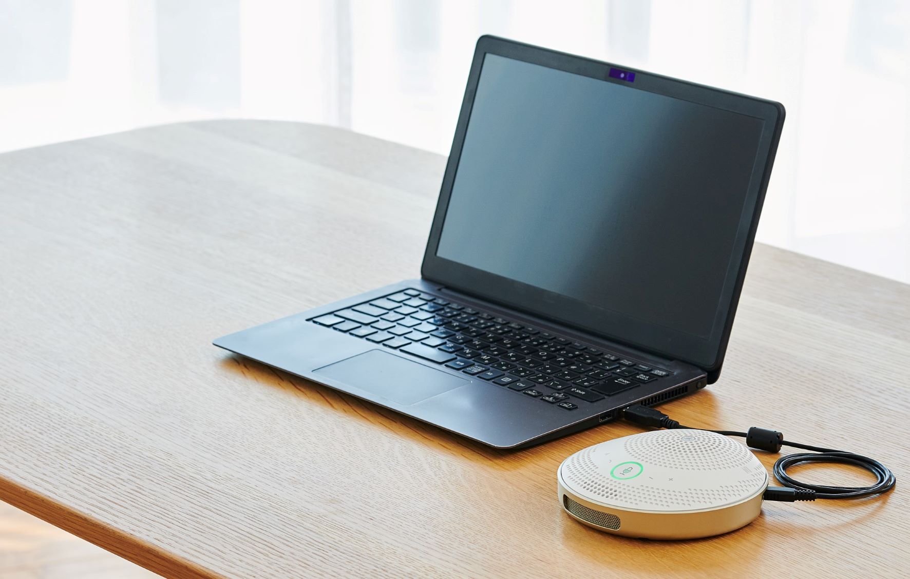 On top of the YVC-200 are the five buttons frequently used in remote communication, namely the microphone mute button, speaker mute button, speaker volume buttons (+/-), and call button, giving you instant access to these functions. Since these buttons are touch sensors, click sounds when buttons like tactile switches are pressed are not delivered as noise to the call partner. Also, a sound is played as feedback to the user when these buttons are pressed.