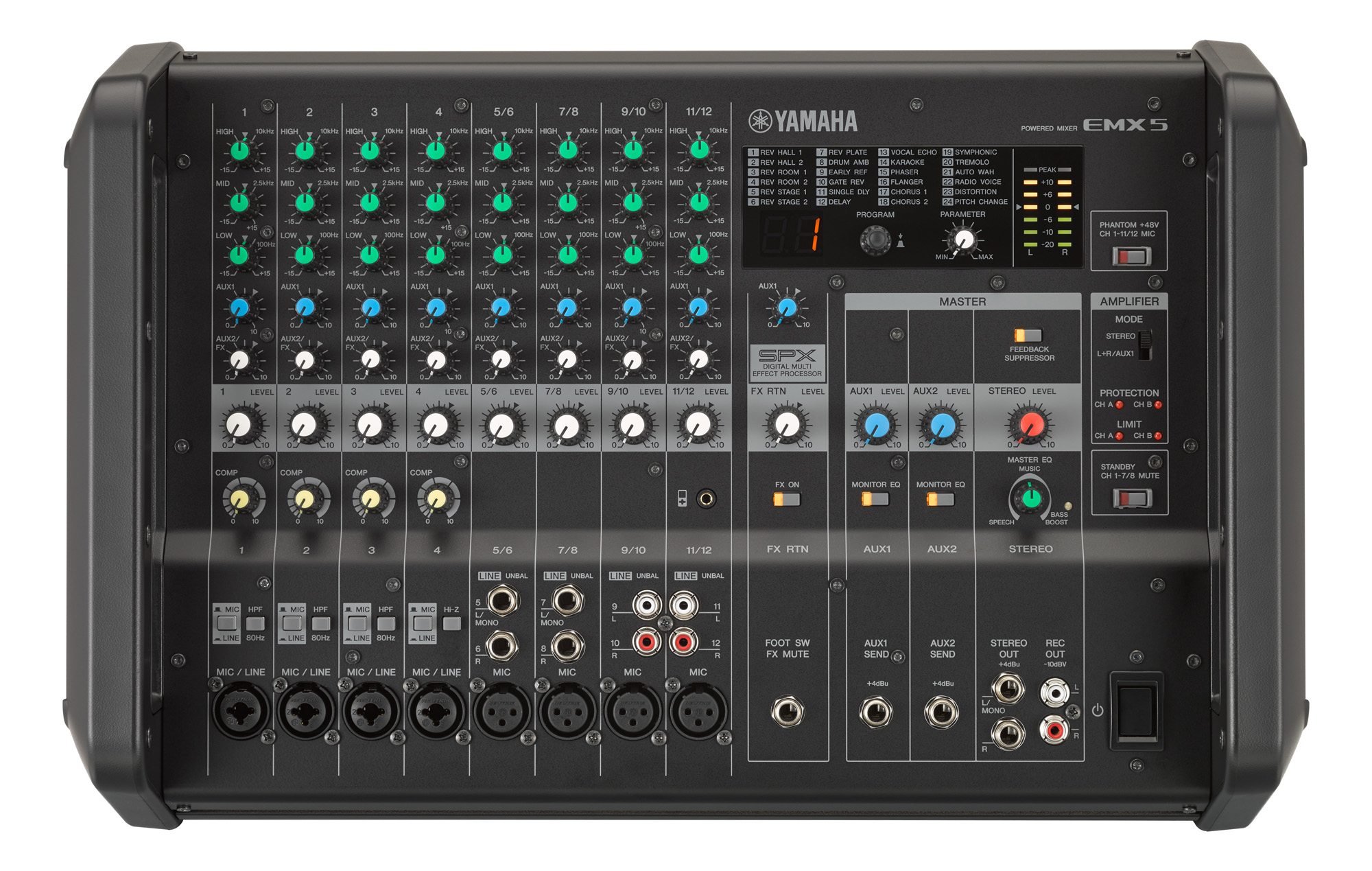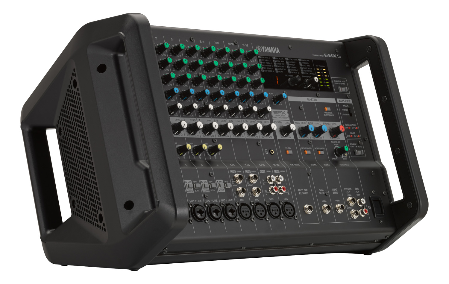 Featuring 12 channels (8 mono channels or 4 mono + 4 stereo channels), built-in high quality effects and a massive 630 watts per channel at 4Ω, the EMX5 is versatile and powerful enough to handle most small and medium gigs.