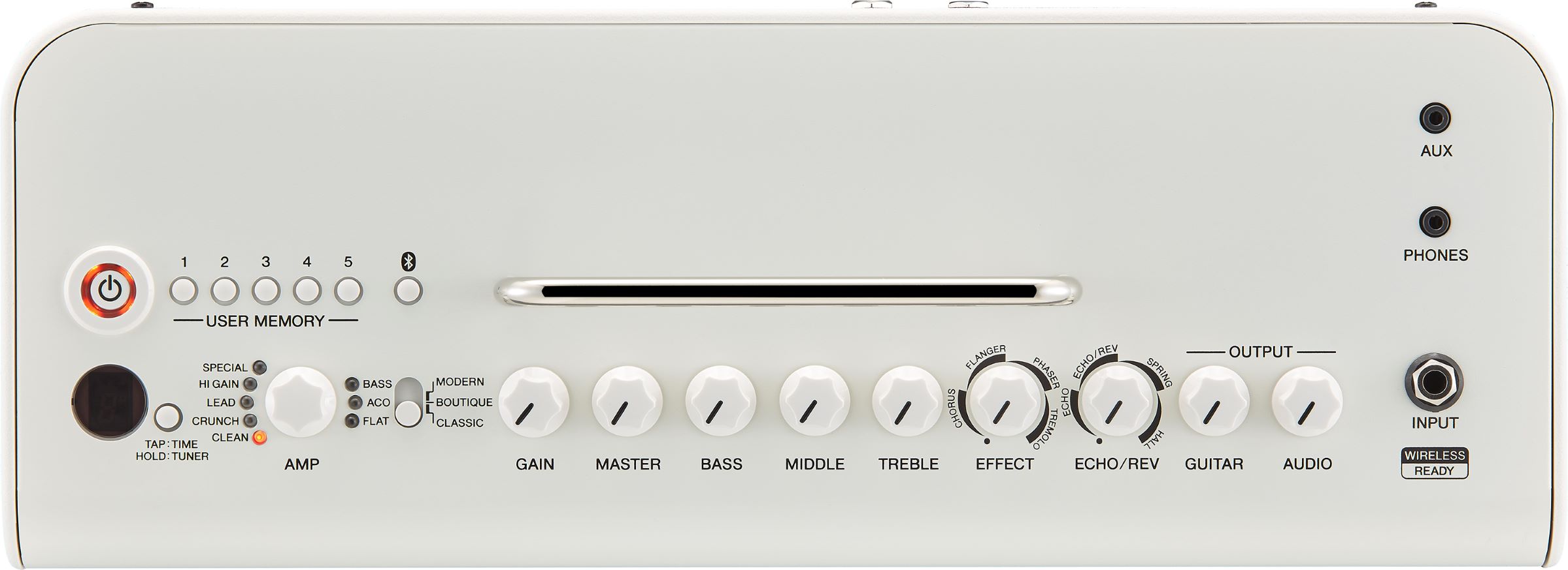 - Controller/Switch: AMP, GAIN, MASTER, BASS, MIDDLE, TREBLE, EFFECT, ECHO/REV, GUITAR OUTPUT, AUDIO OUTPUT, USER MEMORY Switch x 5, TAP/TUNER Switch