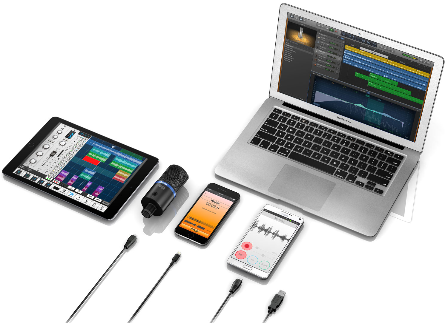 iRig Mic Studio is compatible with all your favorite mobile and desktop platforms. It comes with a female micro-USB port and an assortment of cables: Micro-USB to Lightning for iPhone, iPad and iPod touch; micro-USB to micro-USB OTG for Android (requires either an Android 5 or Samsung Professional Audio device); and micro-USB to USB for Mac and PC. A micro-USB to 30-pin cable is available separately for older iPhone, iPad and iPod touch models.