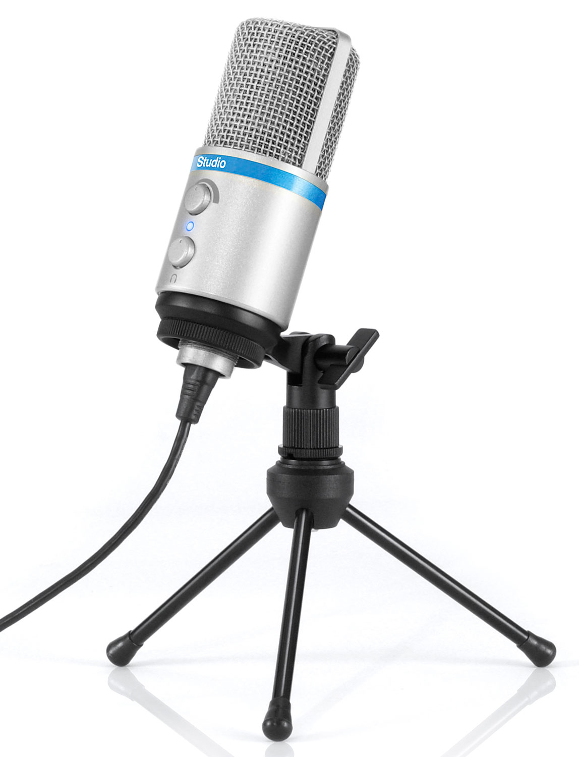 To ensure you’ll always record at your best, iRig Mic Studio comes with a full set of flexible controls: It has a gain control knob and a multicolor LED level indicator. It also includes a headphone output with its own level control for onboard monitoring directly from iRig Mic Studio itself. And, for better positioning while recording, iRig Mic Studio comes with a sturdy and portable tabletop tripod stand.