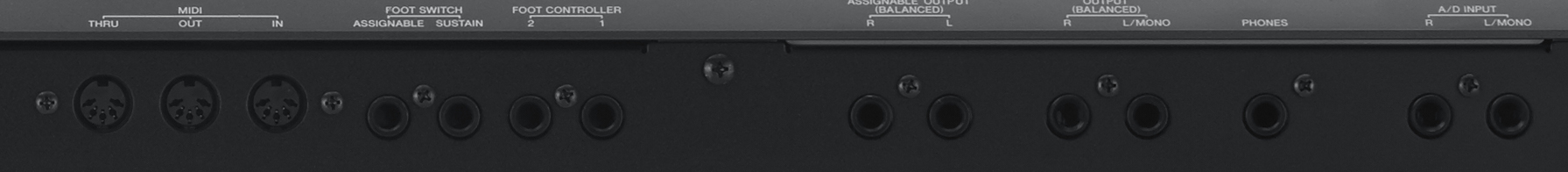- Connectors [USB TO DEVICE], [USB TO HOST], MIDI [IN]/[OUT]/[THRU], FOOT CONTROLLER [1]/[2], FOOT SWITCH [ASSIGNABLE]/[SUSTAIN], OUTPUT (BALANCED) [L/MONO]/[R] (6.3 mm, Balanced TRS jacks), ASSIGNABLE OUTPUT (BALANCED) [L]/[R] (6.3 mm, Balanced TRS jacks), [PHONES] (6.3 mm, standard stereo phone jack), A/D INPUT [L/MONO]/[R] (6.3 mm, standard phone jacks)