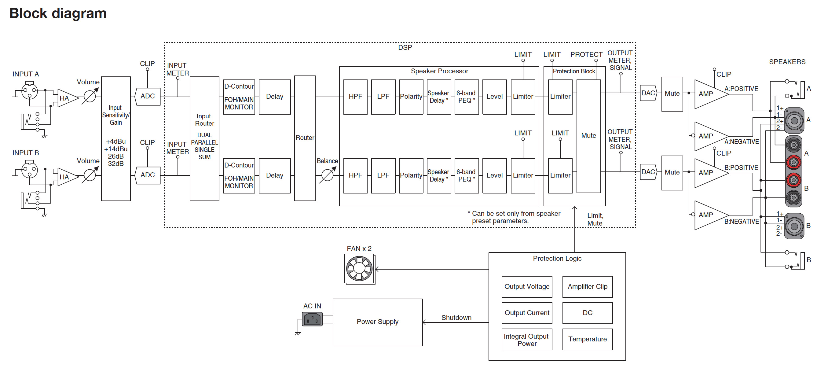 | Processors | Input summing; D-CONTOUR(FOH/MAIN, MONITOR, OFF); Delay(0 - 74msec); HPF/LPF(cutoff frequency 20Hz~20kHz with polarity control); Speaker Processor(6 band PEQ + Limiter + Delay) |