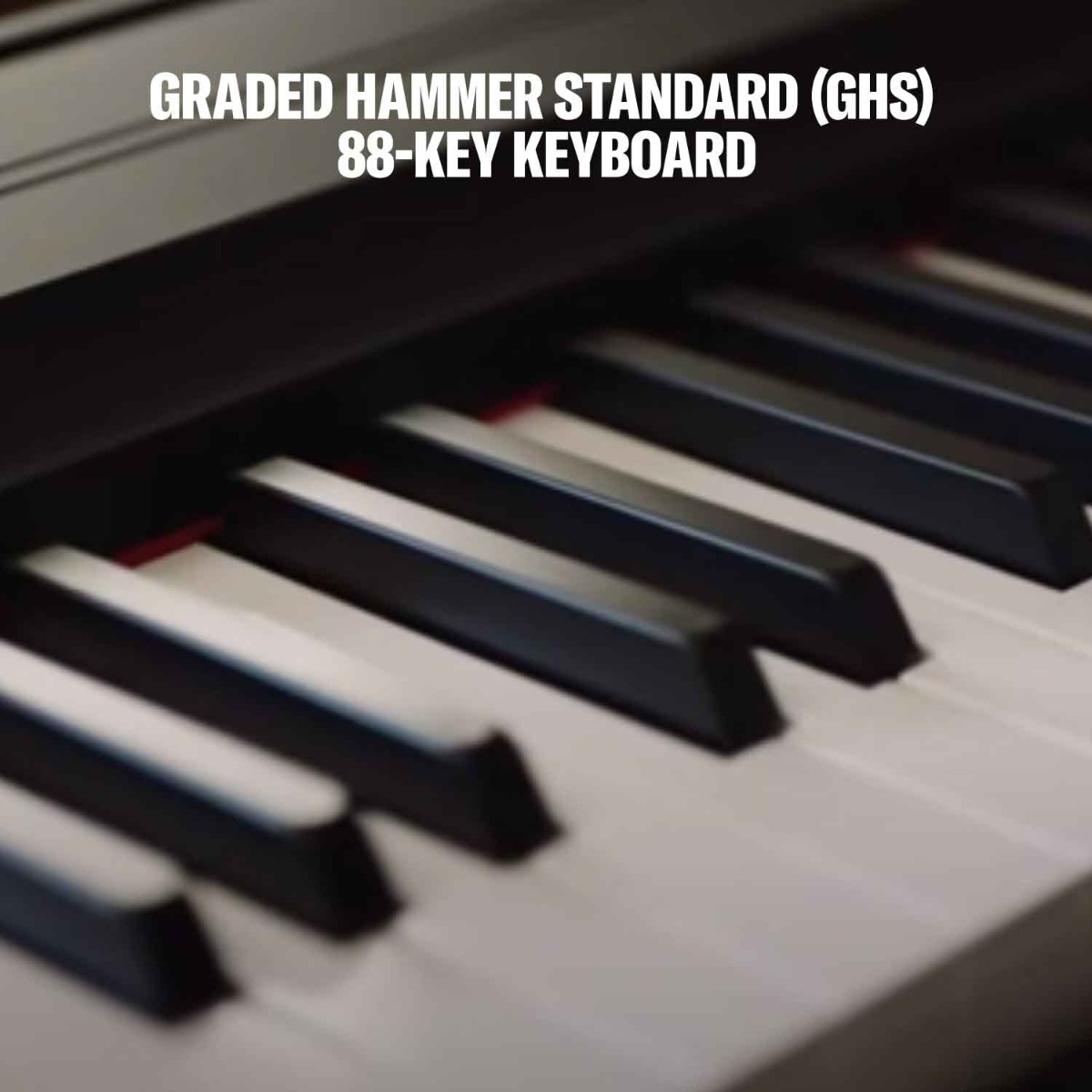 The Graded Hammer Standard (GHS) 88-key piano keyboard provides a heavier touch in the low end and lighter touch in the high end, similar to the keys of an acoustic piano.