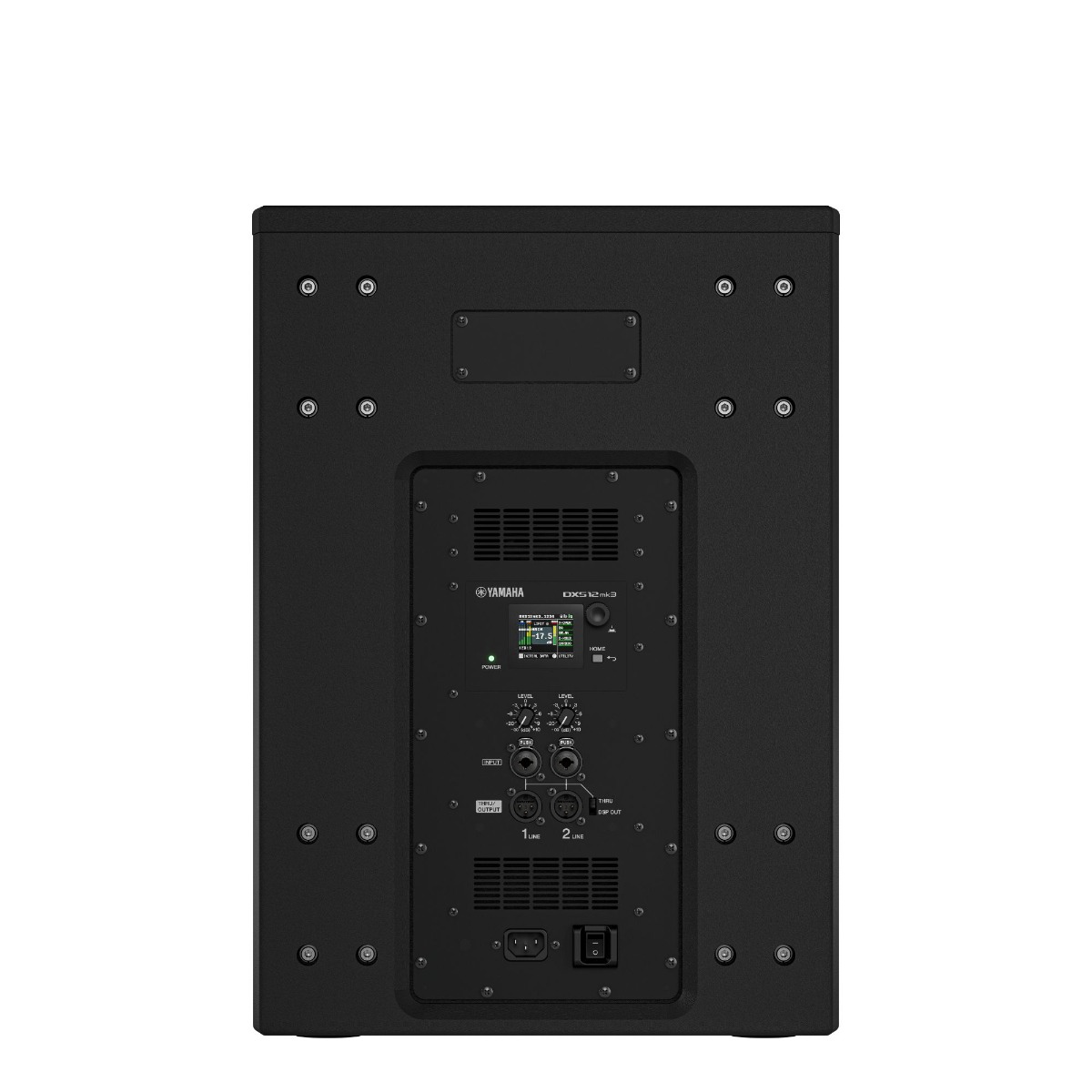 An LCD panel is mounted on the rear, allowing easy operation of parameters such as preset loading, precise PEQ adjustments, delay, and routing. Up to eight user presets can be stored, and factory presets optimized for combined use with DXRmk3 series loudspeakers can be recalled.