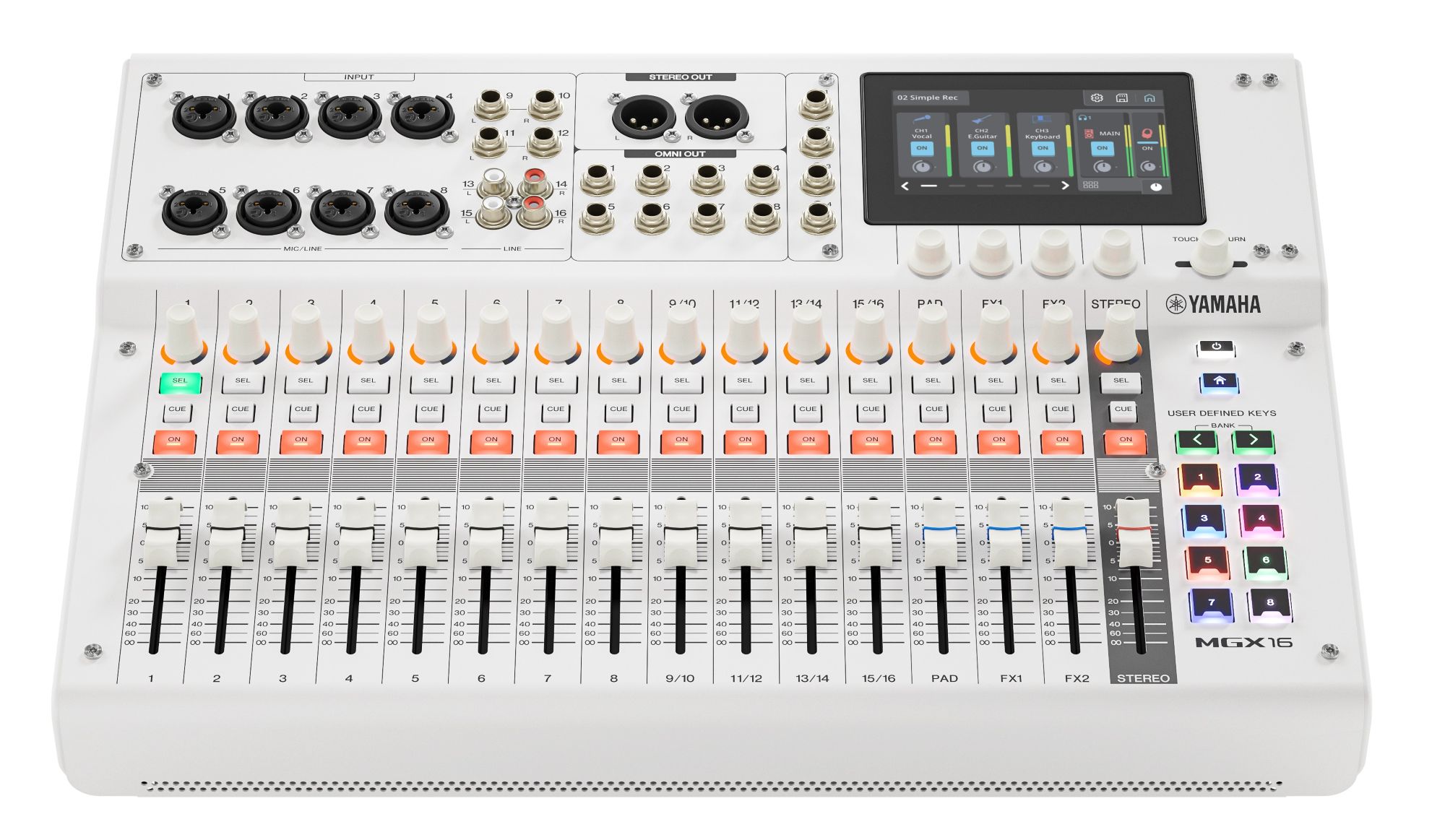 The highly versatile MGX digital mixing console is equipped with professional-quality effects, flexible routing, and a wide range of other features that can all be operated fast and intuitively using its touch-panel GUI, comprehensive controllers, assistive functions that streamline workflow, and scene recall capability. The MGX provides an operating experience that keeps your creative workflow focused and free of interruption.
