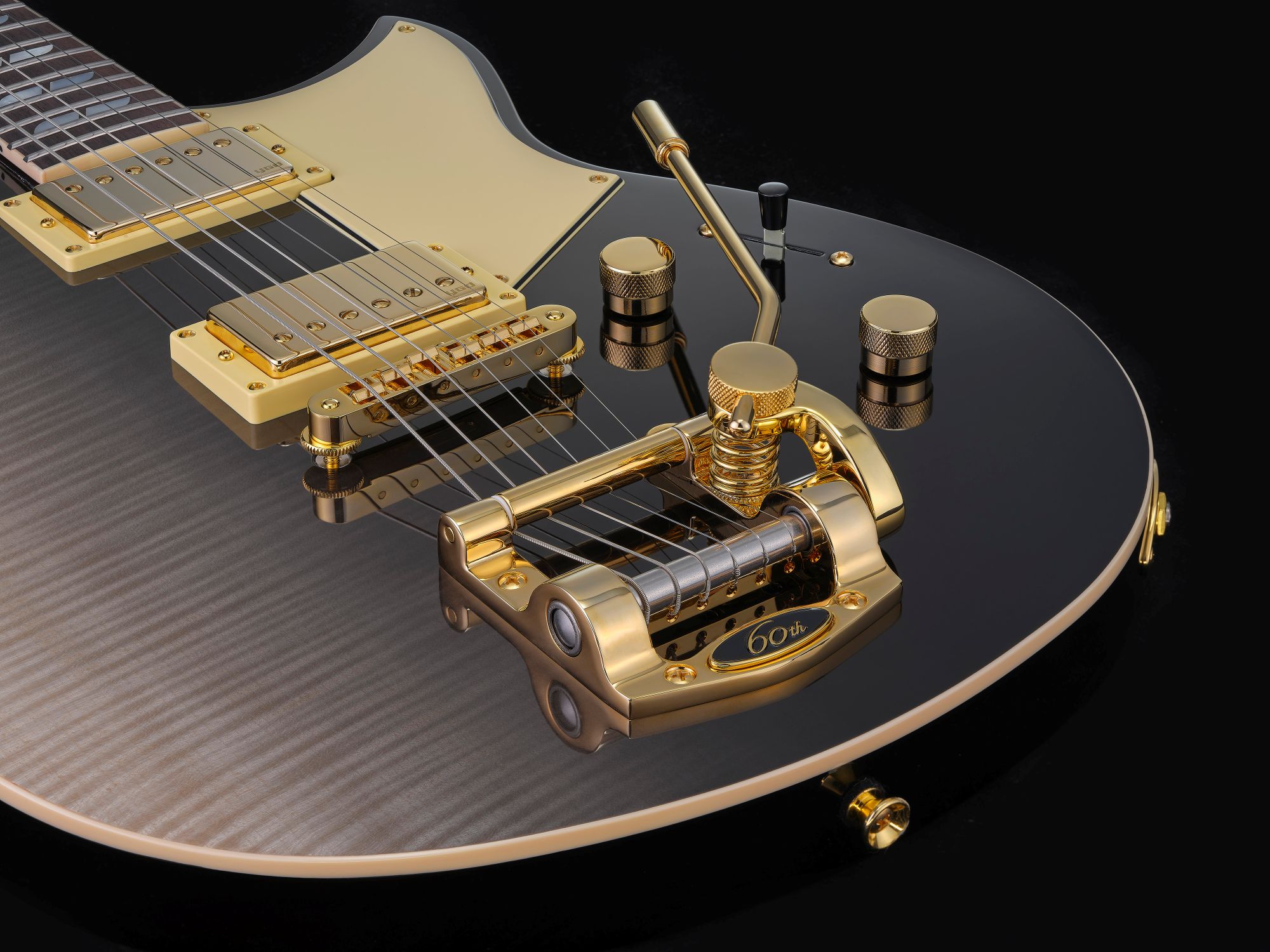 This 60th Anniversary model features a flame maple top with a refined Noble Black finish that showcases luxurious aesthetics and unique character. The Goldo tremolo unit and Gotoh locking tuners offer dynamic range and expressive performance. A chambered body combined with a carbon-reinforced neck enhances tone, reduces weight, and ensures optimal balance. Dual humbucking pickups combined with a 5-position pickup selector and a passive push/pull Focus Switch provides unique versatility for a dual-pickup guitar.