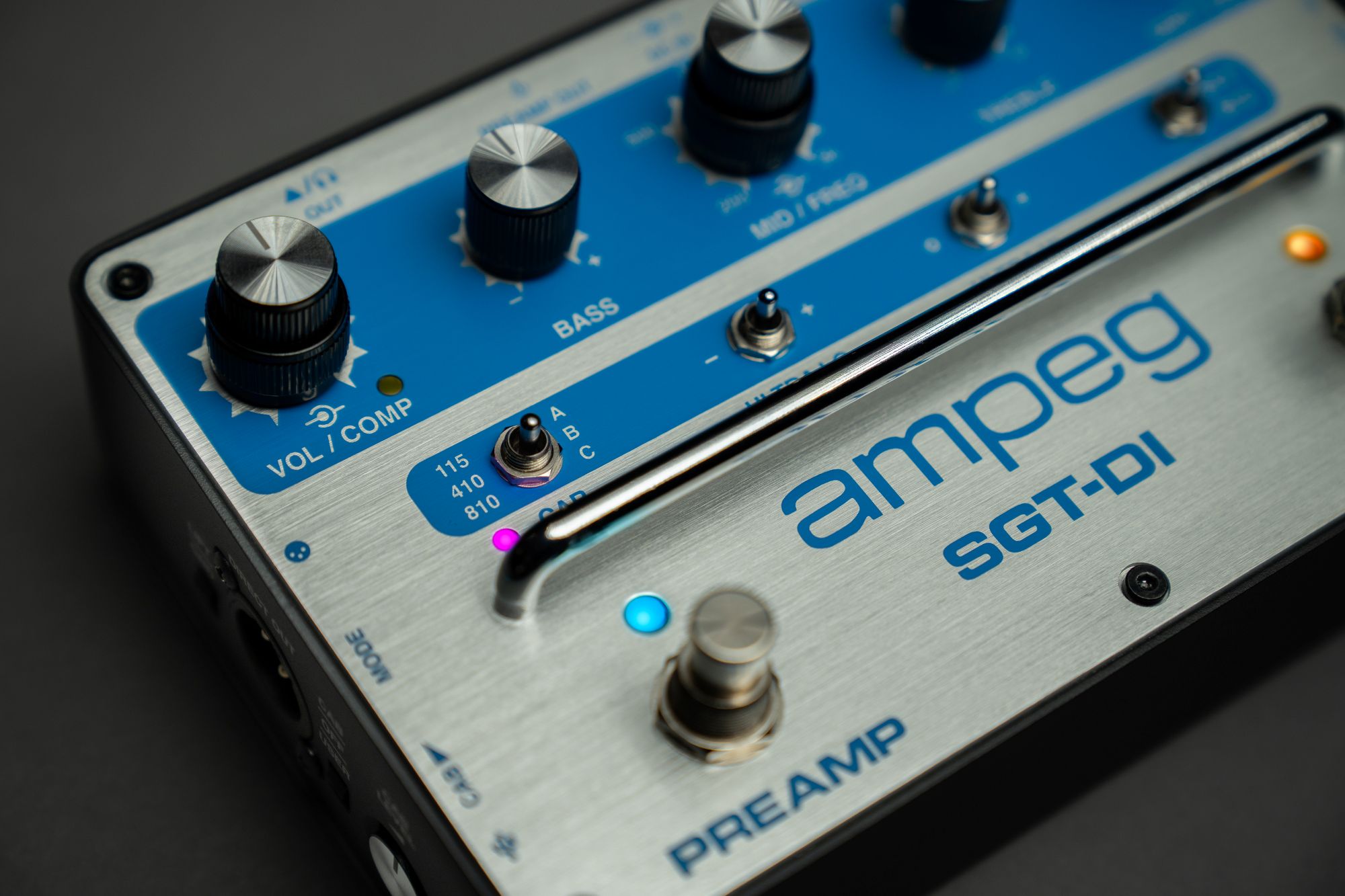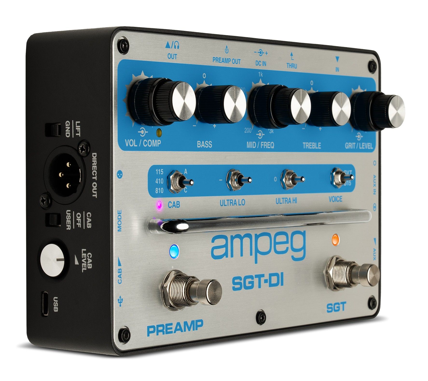 The SGT-DI offers unparalleled tonal sculpting and features designed to integrate seamlessly into any professional setup. Harness the raw power of the Super Grit Technology™ (SGT) overdrive circuit for classic, gritty bass tones. Shape your sound precisely using the responsive 3-band EQ and the signature Ultra-Hi and Ultra-Lo switches, which provide immediate access to broad sonic enhancement. Recording and live sound engineers will appreciate the integrated IR Loader/Cab Simulator, offering genuine Ampeg cabinet emulation direct to the mixing desk or recording interface.