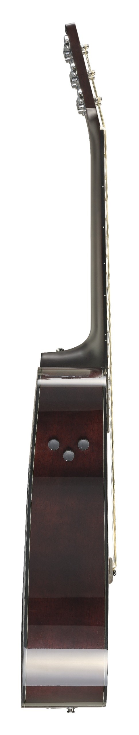Three simple buttons control the effect levels and line out volume level. The small buttons occupy minimal space, reducing the acoustic sound loss that results from removing body wood.