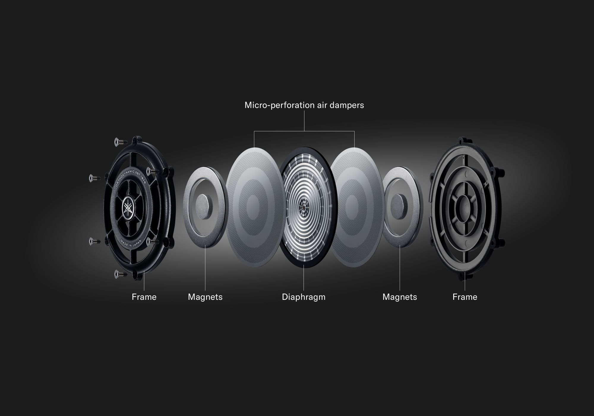The diaphragm features conductive coils on both sides and finely corrugated wave-like patterns across its surfaces. Far lighter than a conventional dynamic driver, it responds with remarkable precision, revealing subtle nuances and airy detail in every performance. Micro-perforation air dampers on both sides control movement with care, preserving the natural dynamism of music without distortion or loss of energy.