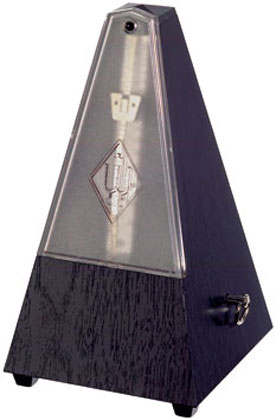 This traditional maelzel pyramid 806K metronome comes in a black plastic case.